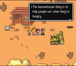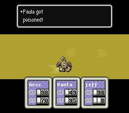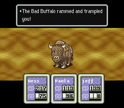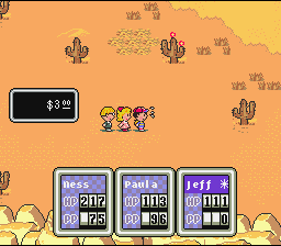 The enemies in the desert are dangerous, so be ready. If you meet a Bad Buffalo, use paralysis on it immediately! It can toast even Ness with a single attack. Use Freeze on Desert Wolves because they can hurt you too. Skelpions can poison you so be careful with them as well.