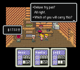 Make your first stop the drugstore. Buy Coins of slumber for everyone and upgrade Ness and Paula's weapons. (If you equipped Paula with a Bionic Slingshot, buy the Deluxe Fry Pan anyway. It's worth the -2 offense because you'll hit a lot more often.)