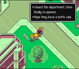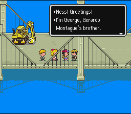 After you've talked to the miner and rested at the shack, make your way back to the bus stop and hop a bus to Fourside. When you're over the bridge, you'll be stopped by George, who will give you the only thing they've found so far -- a Diamond. It looks expensive... what to do with it?