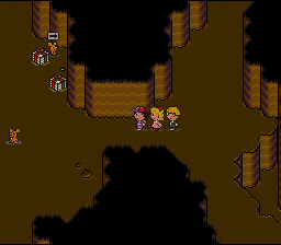 After defeating this mole, walk left, up the ladder, down, go down when the path branches, and then follow the path as it curves upward until it turns left, and you'll enter a clearing with an Exit Mouse and two presents. Make sure you get the Exit Mouse; if you run out of PP you can use it to get out of the maze and rest at the miners' shack.