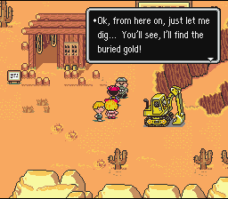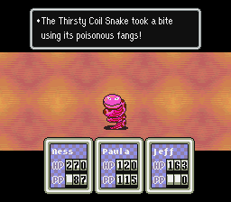 If you have the Magic Truffle, return to Twoson and buy a few ketchup packets. Give all the packets and the truffle to one person, then have that person "Give" the Truffle to him/herself. This will place the Truffle at the end of his/her inventory. Now, if you use the truffle IN BATTLE, you'll regain ~90 PP and one of the ketchup packets will be spent, but not the truffle! This is a great trick to use to survive the gold mine.