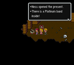 From the clearing, go down and follow the path as it turns left. Use PSI Fire β if you are attacked by a group of Noose Men. You'll find the second Guardian Digger at the end of the path; after defeating it, get the valuable Platinum Band from the present and equip it on whomever needs a defense boost the most.