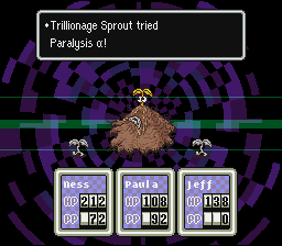 Before long you'll find the Shining Spot and the Trillionage Sprout. This is a tough boss! If Jeff still has the Big Bottle Rocket, fire it now. If not, use regular Bottle Rockets, the HP Sucker, PSI Fire or Freeze and PSI Special. (DON'T use PSI attacks if the user is Mushroomized!) If you are Diamondized, it's just like being knocked out. There's nothing you can do about it, unless you have a Cup of lifenoodles.