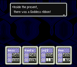 Ghosts of Starman drop Goddess Ribbons 1/128 of the time. If you want to try winning this nice defensive item, a good strategy is to give Paula a Rabbit's Foot so that she'll get the first move in battle. Then have her use PSI Shield Ω. The Ghost of Starman will attack with Starstorm, but it'll bounce back and kill him. Pretty easy! Now repeat many times until you finally win the item.