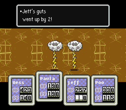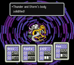 Thunder & Storm can be pretty nasty, but thankfully you have the Franklin Badge, which will repel their Crashing Boom Bang attack. Throw everything you have at these guys, particularly your strongest PSI Freeze attacks. Keep in mind that at this point, both Paula and Poo can use Freeze, so have both of them using it almost every turn.