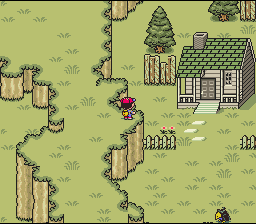 When you're almost to Happy Happy Village, you will see on your right an isolated cabin. You can't reach it now, but it will be important very soon. Keep it in mind.