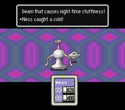 The other enemies in Peaceful Rest Valley are tough but manageable if your level is around 15 or so. The Lil' UFO will dodge many of your Bash attacks, plus PSI Rockin' doesn't work on it very much. Save it for last if you can and dispatch enemies that are easier to defeat first. The Spinning Robo can do a lot of damage, so try to destroy it first. Also, both enemies can give you a cold! Use a Cold Remedy or Healing α if they do.