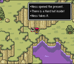 Make sure you get the Hard Hat. This is an extremely valuable defensive item. After you cross a bridge, the path will lead you northward and then split to the left and right. Go left here and walk a little ways and you will find a present with the Hard Hat inside. If you're out of inventory space, sell or drop the Mr. Baseball cap. Make sure you equip your new item!