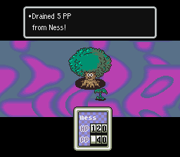 Mobile Sprouts are good enemies to pick on for exp. at this point because they're fairly weak, but beware! Their PSI Magnet can quickly drain your vital PP from you. If you have a Teddy Bear, though, it will usually harmlessly absorb the magnet attack. Also, Sprouts tend to hang around with Territorial Oaks, so be careful when approaching them.