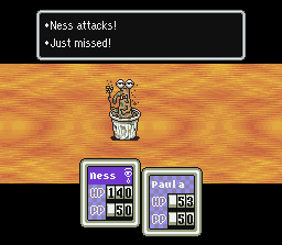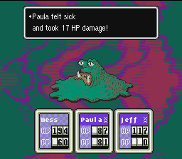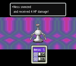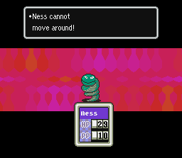 This is what happens to Ness if you forget to call his mother from times to times, Ness will get homesick and waste some turns thinking about steak and being an sad kid. Healed By: Talking to your mom; Calling your mom on the phone; Using a Chick |