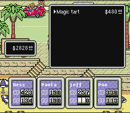 After Poo joins your party, the Magic Cake lady begins selling a new item. Her Magic Tarts ($480 apiece) replenish 20 PP each. They're a bit pricy though, and it's more worthwhile to stock up on Brain Food Lunches than on these babies, since BFLs will restore more PP, along with HP (and will even completely restore Poo's HP and PP), all this at a cost about $320 more than the Magic Tarts.