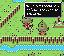 | When you feel you're up to it, rest up to full power, get a Teddy Bear or two, and then head east to the cave. Work your way through, fighting off the Mobile Sprouts that attack you. Once on the other side of the cave, you won't get far, because a giant iron pencil (why not?) will be in your way. You don't have any other choice, so head back to Twoson. Apple Kid will give you a call when you get there. |