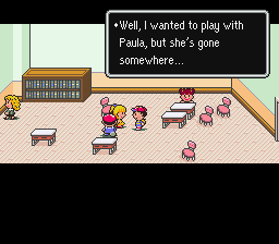 | The citizens in Twoson are abuzz about the recent kidnapping of Paula, a local (and very special, as you'll soon find out) girl. Go to the Polestar preschool where she lives and talk to her parents. Her mom isn't worried and her dad apparently isn't aware that she's missing, even though the rest of Twoson is. Don't forget to grab the Teddy Bear from upstairs! |
