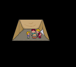 Not too far along in Jeff's journey south, you will come across an isolated tent. Inside, you will encounter two guys who will graciously offer you to rest. Take the opportunity! In fact, it's a good idea to fight enemies around this tent and build up levels a little, since Jeff has no PP for recovering his health and only cookies as food. Try to get up to level 5 or 6 before you move on.