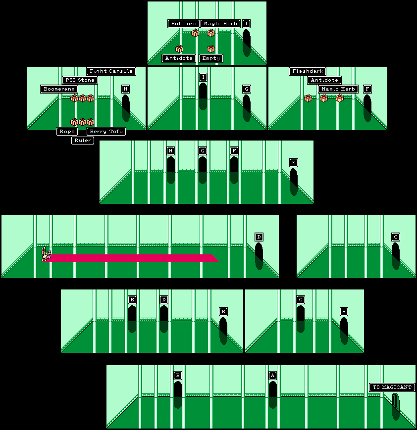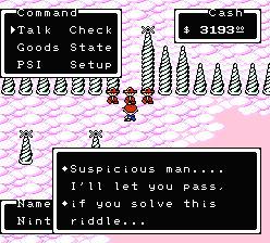 | As you may have noticed, there's a large castle in Magicant. It's the home of Queen Mary, the ruler of all you see. However, her guards have access restricted to all who enter -- save the clever person who can figure out their riddle. Cheating with telepathy is highly recommended! |