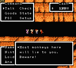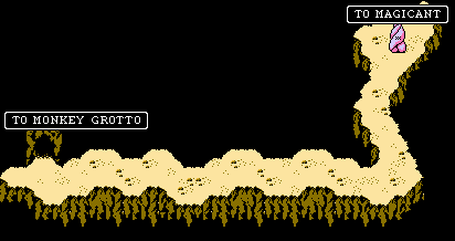 | Upon descending the ladder, you'll find yourself in a network of brown caves filled with monkeys. These chimps aren't to be trusted: they're all pathological liars. However, no harm will come to you from them, so explore the underground maze at your leisure. |