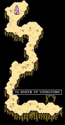 | As you exit Magicant, you'll emerge in a new cave (this is the cave you'll exit now when you use the Onyx Hook, too). Exit it to find yourself in a grassy area south of Yucca Desert. Walk east and follow the train tracks to get to Youngtown. |