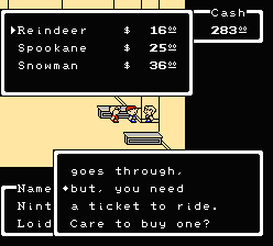 | Talk to the man at the desk and buy some tickets to Reindeer. Kick back and watch the world go by in the train! Be glad that it now works: the train tunnel from Merrysville to Reindeer holds some super-tough enemies that can devastate low-levelled travellers like yourselves. |