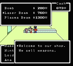 The shops have nothing special -- save for some handy items for Loid. It's advisable to stock up on some of these babies: the Plasma Beam is especially useful, dishing out 70-80 PK Beam damage per use! You probably have loads of cash at this point, and since you won't be buying much any more, why not trade in your Bottle Rockets and Bombs for some real weaponry?