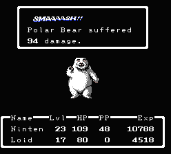 | The enemies here are mean! You may find it best to flee from most bouts, as Silver Wolves can gang up on you easily. Polar Bears can hit hard if you're underlevelled, too, so approach with care! Bigfoots and Lone Wolves shouldn't be too tough for you, however. |   |