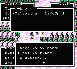 | ...another trip to Magicant is destined. Equip her with the best defensive items you can buy, as her defenses are fairly weak. Also, if you talk with the other Swimming Cat, you can win what's in his hand with Ana by your side. Use Telepathy to earn the Magic Ribbon, upping Ana's magic powers. |   |