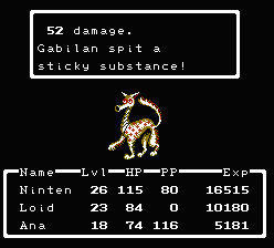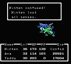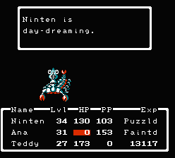 Only Ninten can get this status effect. When breathes in vehicle exhaust, this makes him unable to fight. Healed By: Healed at end of battle; Asthma Spray |