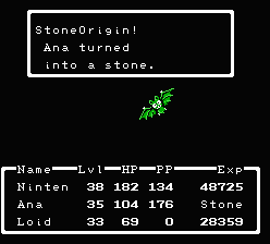 Your character turns to stone, effectively giving him/her the unconscious status (akin to paralysis). If the entire party becomes unconscious or stones, it's game over. Healed By: Blue-haired healers; Healing γ |