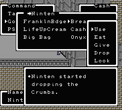 | Right away, it would be a good idea to Use the bread you bought. If you Use it (DON'T Eat it!), you'll drop crumbs that you can follow back to without getting lost or having to battle. If you have a Repel Ring, use it as well. The enemies in here are just Rats and Barbots, the former not even worth your time to fight. |