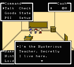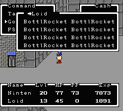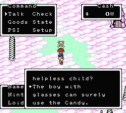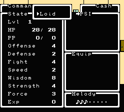 | In any case, if you look at Loid's stats, you'll notice the boy's only at level 1. Yep, you have to train him for a bit unless you want him to die often, unfortunately. A trip to Magicant is useful here, as you can bolster his defense and train amongst weaker enemies. Take some cash out of the ATM in Merrysville before you Teleport, as it will save you a dangerous trip to the Benevolent Old Man. |