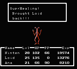 It's best to level up here a while, as the foes in the next area gain a significant level of difficulty. Getting Ana to level 22 would be ideal, and the extra PP helps a lot. If you're in a hurry, though, it would be best to train until Ana learns Super Healing: it revives fallen comrades!