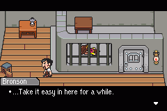 Flint wakes up inside the town's jail. Bronson tells him to cool off for a while, but that once he's allowed out, to come visit him and get the Drago Fang from him. He then leaves you to sit in your cell. Check the cell door, the table, and then the door again.