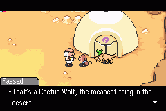 The Cactus Wolf isn't happy to see you. Just keep Salsa's HP up with any Nut Bread or Beef Jerky you have. Salsa's attack won't do much damage, so either defend, use Running Bombs, or use Monkey Mimic. Fassad will end this fight soon enough.