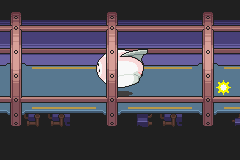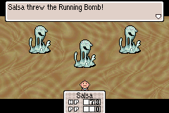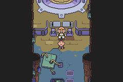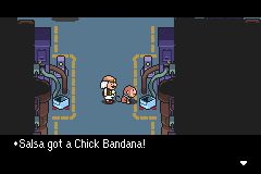 | Soon, you'll come to a small intersection. Hop out here and grab the gift boxes near the cables. Inside, you'll find a Nut Bread and a Chick Bandana for Salsa. There's a ladder in the northwest corner leading to a frog. Save, then take the Pork Bean to the next room. |