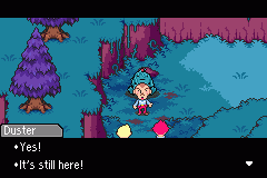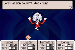 Before venturing forward, now is a good time to backtrack all the way to Osohe Castle. The reason is to collect a great weapon for Duster that comes in handy (or footy, in this case). Head to Osohe Castle and go to the room where you fought Mr. Passion. There you will find Lord Passion. After defeating him you will find the Mystical Footwear. These are only obtainable in this chapter! So go get it now. Backtracking later in this chapter will only prove to be more time consuming.