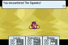 As you leave the large stone door behind a bad mouse named the The Squeekz attacks. He shouldn't be too hard to take down. Afterwards, he decides to head toward the highway. You should head there next as well. Go east and you will run into the Mole Cricket from Lucas's childhood. He will take you to the Mole Cricket hole. Since the path to the highway is blocked, you might as well dive in.