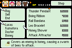 | You must free the captured Mr. Satruns that are being held in their very own homes. In the first house you will walk into a group of Mr. Saturns being interrogated. This intrusion will anger the the Pigmasks and the Frightbot and they attack. They shouldn't prove to much of a problem. The second house has a single Frightbot and a present that contains a Good Kid's Shirt. The next house contains two Frightbots and presents with Strawberry Tofu and yet another fart inside. One of the Mr. Satrun's wants to give you thanks. If you say "YES" you will get a Dragonfly. If you say "NO" you will get a Silver Dragon Fly. You can get both. |