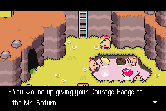 Now that the final bird has been collected, go take a quick dip in the hot spring. Have some coffee with the Mr. Saturn and watch some words of encouragement scroll on by. Once this has passed, a Mr. Saturn tells you everything is ready. He also takes your Courage Badge to make it all sparkly.
