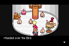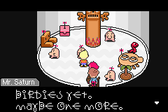Getting down the cliff will be a breeze thanks to the ladder the Mr. Saturns installed. Continue towards the valley. A Pigmask will drop in and blow up the exit! The only way out of the valley is with the Mr. Saturns help. Go to the house closest to the cave and talk to the Mr. Saturn in the middle of the room. It seems you will be flying out of here with bird power. But you need to catch one more bird.