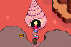 For some presents take the first south tunnel to find a Saltwater Gun. Take the far right tunnel to find a yet another farting present and a Luxury Bananna. There is also a Magic Butterfly in this room as well, so come back her if you need more PP. And finally there is a present box in the center that has a Secret Herb.