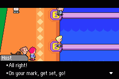 In order to be determined if you are fit to meet with Master Poky, Lucas and company must partake in a few games. And lose at them. The first game you should hit only 9 moles. Hitting the man will get you shocked. After losing go to the next room.