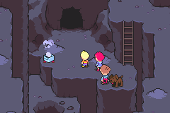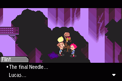 Follow the winding eerie path. Eventually you will come across a defeated Flint. Press on and you should come across a present with the Real Bat inside. Continue to follow the path until you reach a ladder. Ready yourself, because you are about to fight a series of fight that will determine who pulls the final Needle.