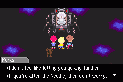 Sensing he is losing, Porky jumps in the Absolutely Safe Capsule. Since there is absolutely no way to do any damage, the battle is over. Dr. Andonuts shows up to explain that even though Porky is inside, he can never come out. It may not be a total victory, but at least Porky will never pester anyone again. Continue to follow the path.